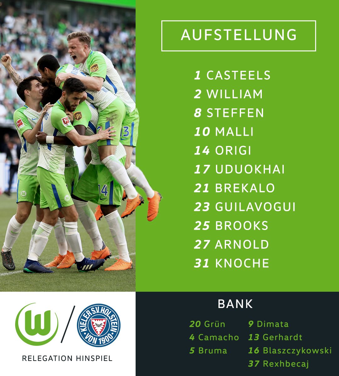 Casteels – William, Knoche, Brooks, Udo – Guilavogui, Arnold – Steffen, Malli, Brekalo – Origi